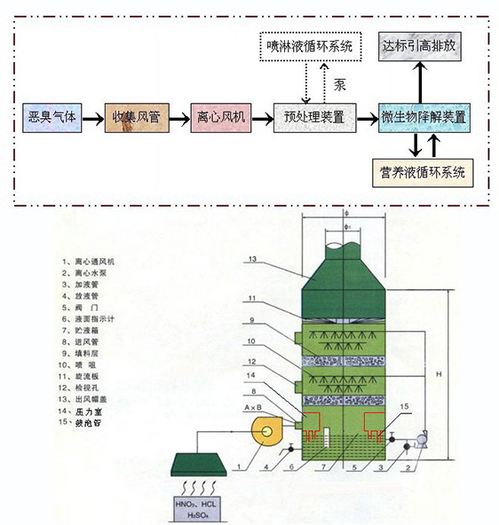 廢氣凈化塔內(nèi)填料層作為氣液兩相間接觸構(gòu)件的傳質(zhì)設(shè)備。填料塔底部裝有填料支承板,填料以亂堆方式放置在支承板上。填料的上方安裝填料壓板,以防被上升氣流吹動(dòng)。廢氣凈化塔噴淋液從塔頂經(jīng)液體分布器噴淋到填料上,并沿填料表面流下。氣體從塔底送入,經(jīng)氣體分布裝置分布后,與液體呈逆流連續(xù)通過(guò)填料層的空隙,在填料表面上,氣液兩相密切接觸進(jìn)行傳質(zhì)。當(dāng)液體沿填料層向下流動(dòng)時(shí),有時(shí)會(huì)出現(xiàn)壁流現(xiàn)象,壁流效應(yīng)造成氣液兩相在填料層中分布不均,從而使傳質(zhì)效率下降。因此,廢氣凈化塔內(nèi)的填料層分為兩段,中間設(shè)置再分布裝置,經(jīng)重新分布后噴淋到下層填料上。